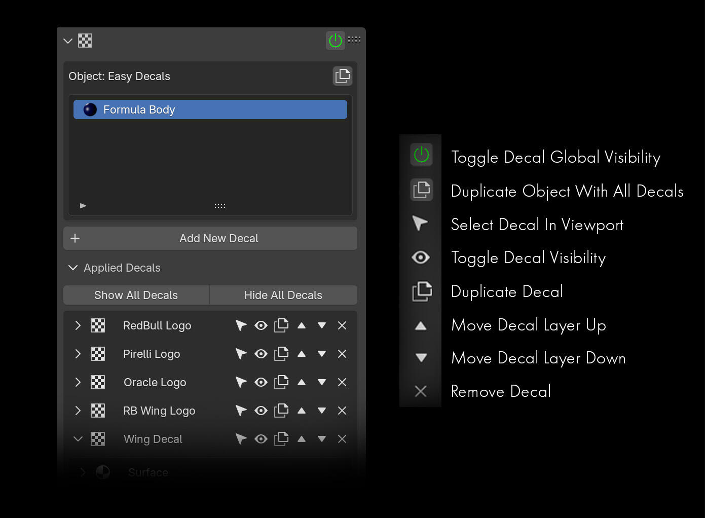 Add decals to seperate materials and manage each decal's color, wear & tear and other properties. Toggle the decals visibility and change the layering order all in one panel.